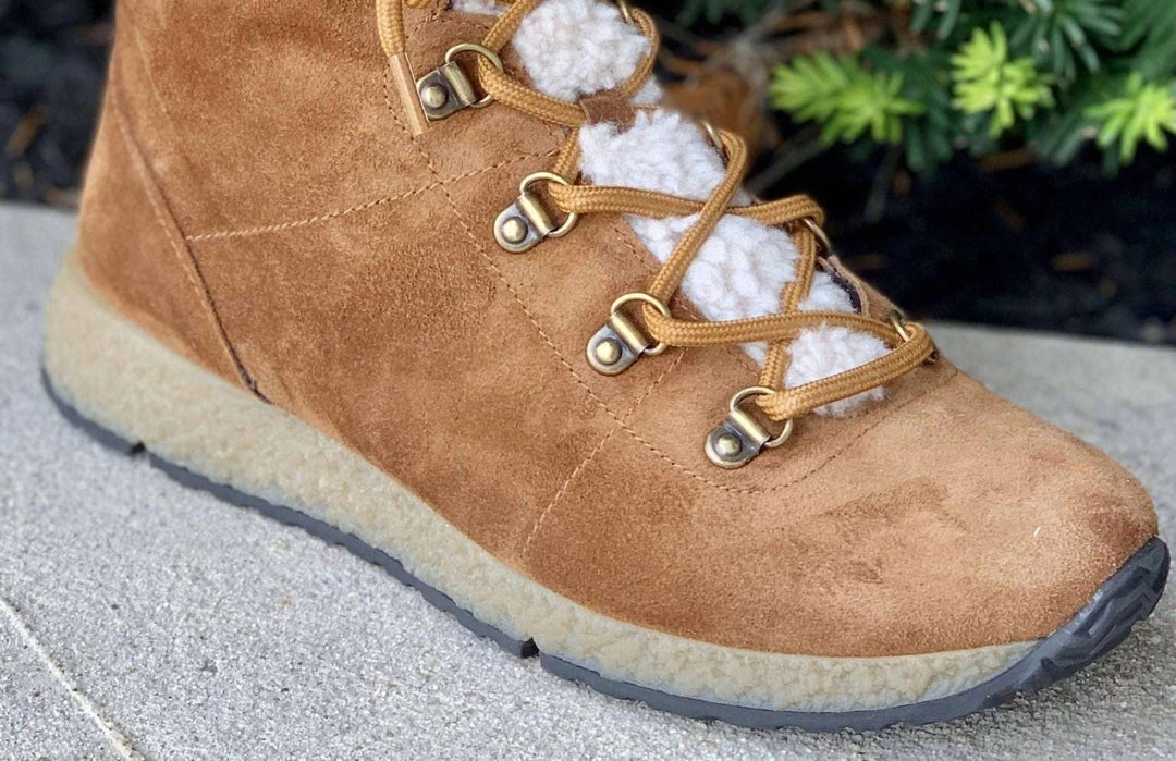 This cognac brown suede tie boot has shearling detail across the laces and around the top of the boot.